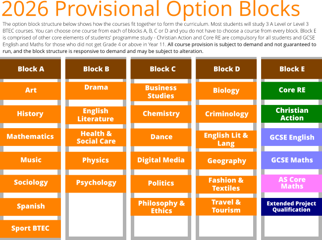 The option block structure below shows how the courses fit together to form the curriculum. Most students will study 3 A Level or Level 3 BTEC courses. You can choose one course from each of blocks A, B, C or D and you do not have to choose a course from every block. Block E is comprised of other core elements of students' programme study - Christian Action and Core RE are compulsory for all students and GCSE English and Maths for those who did not get Grade 4 or above in Year 11. This structure is provisional, and all course provision is subject to demand and not guaranteed to run.